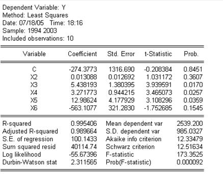 利用Eviews软件,输入Y、X2、X3、X4、X5、X6等数据,采用这些数据对模型进行OLS回归,结果如表3-2所示。
